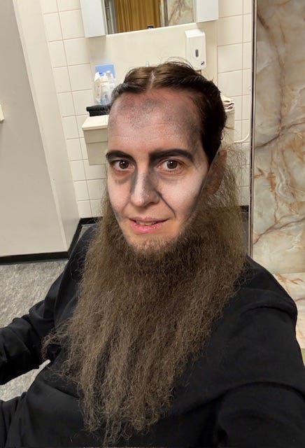 A while later we were out of our dressing rooms and on stage in the triptych, waiting for stage management to hold a white sheet of paper into the light to quietly signal our upcoming departure with the Fake Painting Express. Once that piece of paper got shown, we all stuck our heads through the hole, and choir members all around me announced I had to push the beard through the hole. I did and while doing so, like a squirrel trying to store some very puby nuts, I could hear and feel a tiny tug, releasing the tuft of beard off my chin. I pushed my head up in a panic, which immediately caused the beard to hurl itself towards my forehead, like the face hugger in Alien. As we were already starting to reveal ourselves slowly to the audience I managed to pull it down just in time, to the place it should be. Frozen in rocket man pose, unable to hold onto the beard, I spent the entire ride in fear the cursed thing would swoop swoosh down like a feather in a pillow commercial, landing on Scarpia.