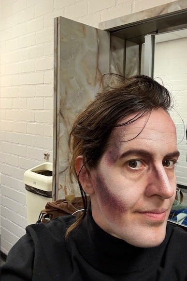 I had to basically hurl myself forward like a human rocket with people so close to me on both sides I couldn’t figure out where to place my arms any other way than straight next to my body like a diving seal. This wasn’t the only challenge that night. The woman I was replacing was in a spot on the painting that required a beard. A fancy opera one that needed glue to be stuck in place and quite a bit of make-up time.
